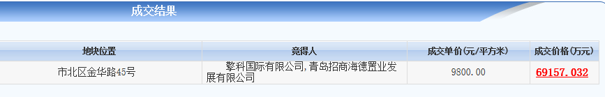 3月30日,擎科世界有限公司,青岛招商海德置业发展有限公司以6.92亿的总价取得市北区金华路45号地块(毗连地铁1号线水清站),地块有2家竞买人参加报名。占地面积20162.4㎡,容积率3.5,规划修建面积70568.4㎡,其间商品住所占比33.4%,楼面地价9800元/㎡,竞买保证金3.46亿元。