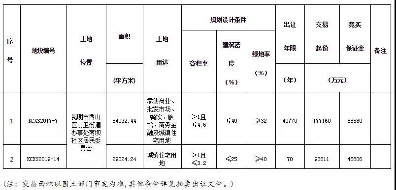 依据布告,此2宗土地编号为KCXS2017-7、KCXS2019-14号地块。其间KCXS2017-7号地块土地性质为零售商业、批发市场、餐饮、旅馆、商务金融及乡镇住所用地,容积率>1且≤4.6,面积54932.44㎡(约82.4亩),买卖起价177160万元,开始楼面价7011元/㎡,开始土地单价2150.03万元/亩。