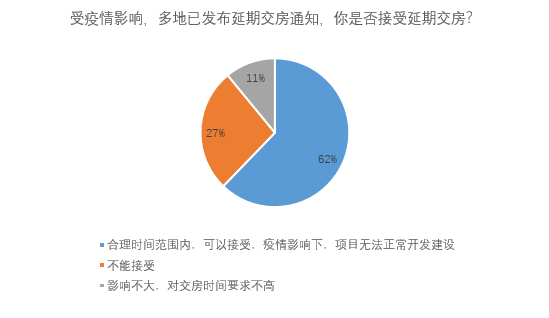 在“受疫情影响,多地已发布延期交房告诉,你是否承受延期交房?”这项查询中有超62%的网友表明,疫情影响下,项目无法正常开发建造,在合理时刻范围内,能够承受延期交房。超四分之一的网友表明虽然有疫情影响,可是仍不能承受延期交房,希望能尽快收房。